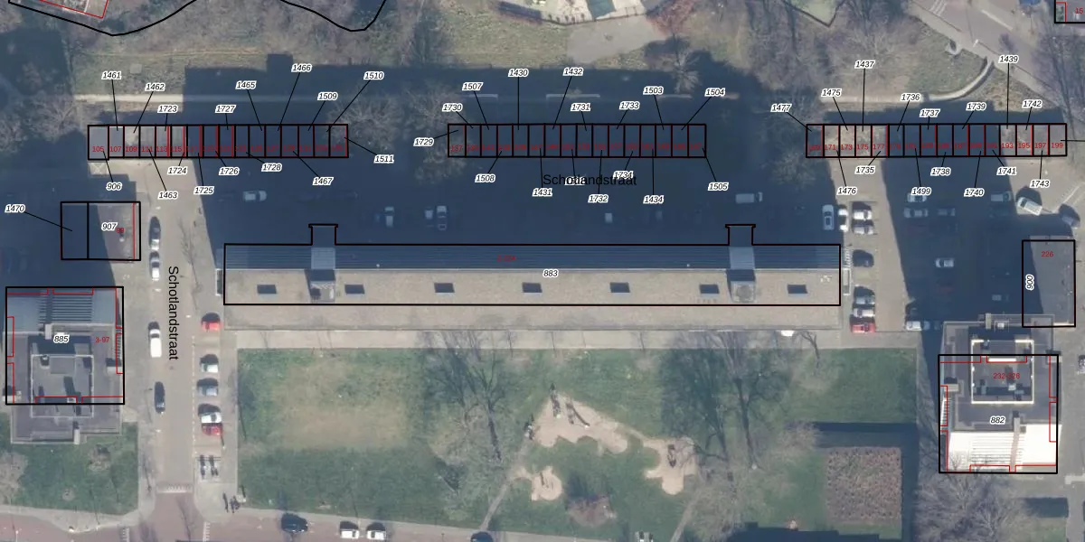Het perceel waarop Schotlandstraat 86 staat heeft een oppervlakte van 1305 m². Dit is een zeer groot perceel. De perceeloppervlakte wordt geregistreerd door het Kadaster. Gedetailleerde informatie over de maten van dit perceel kunt u vinden in het rapport Kadastrale kaart met maatvoering van Schotlandstraat 86.