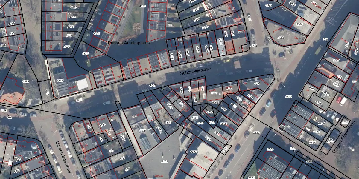 Het perceel waarop Schouwtjeslaan 2-D staat heeft een oppervlakte van 50 m². Dit is een klein perceel. De perceeloppervlakte wordt geregistreerd door het Kadaster. Gedetailleerde informatie over de maten van dit perceel kunt u vinden in het rapport Kadastrale kaart met maatvoering van Schouwtjeslaan 2-D.
