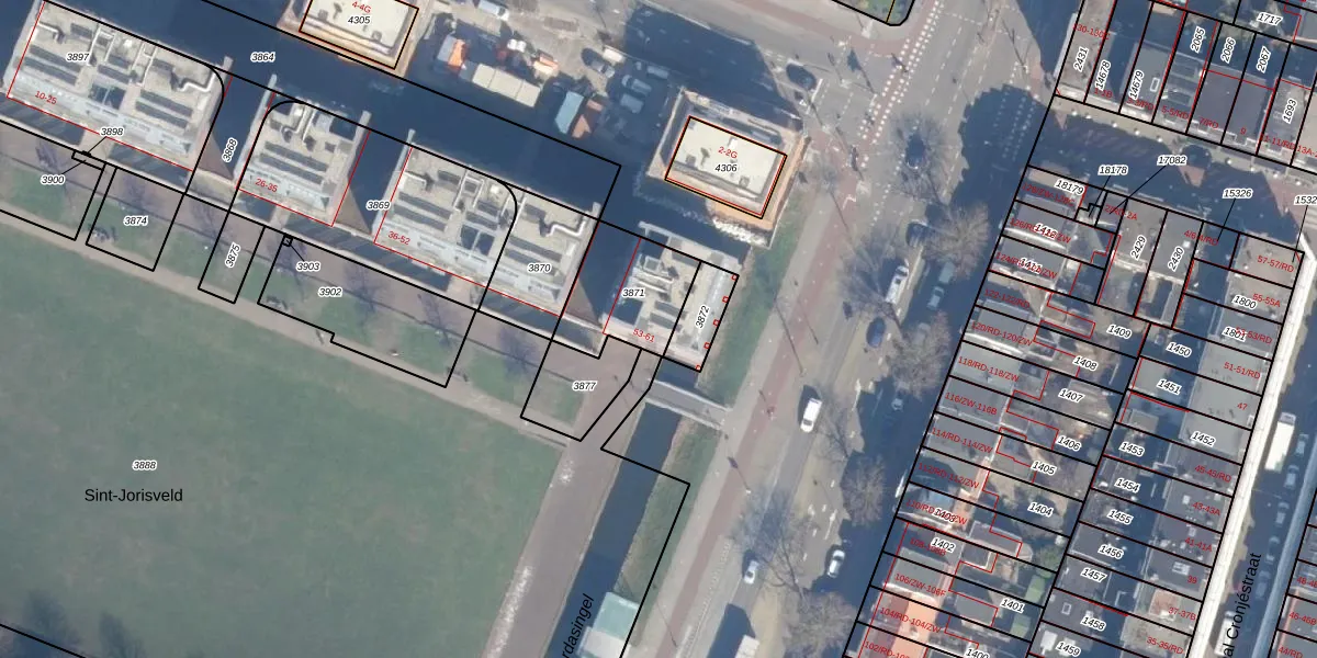 Sint-Jorisveld 55 is gelegen op kadastraal perceel HLM01G3871. Deze kadastrale aanduiding is uniek en wordt gebruikt door het Kadaster om eigendomsrechten en andere zakelijke rechten vast te leggen. Het perceel maakt onderdeel uit van de kadastrale gemeente Haarlem.