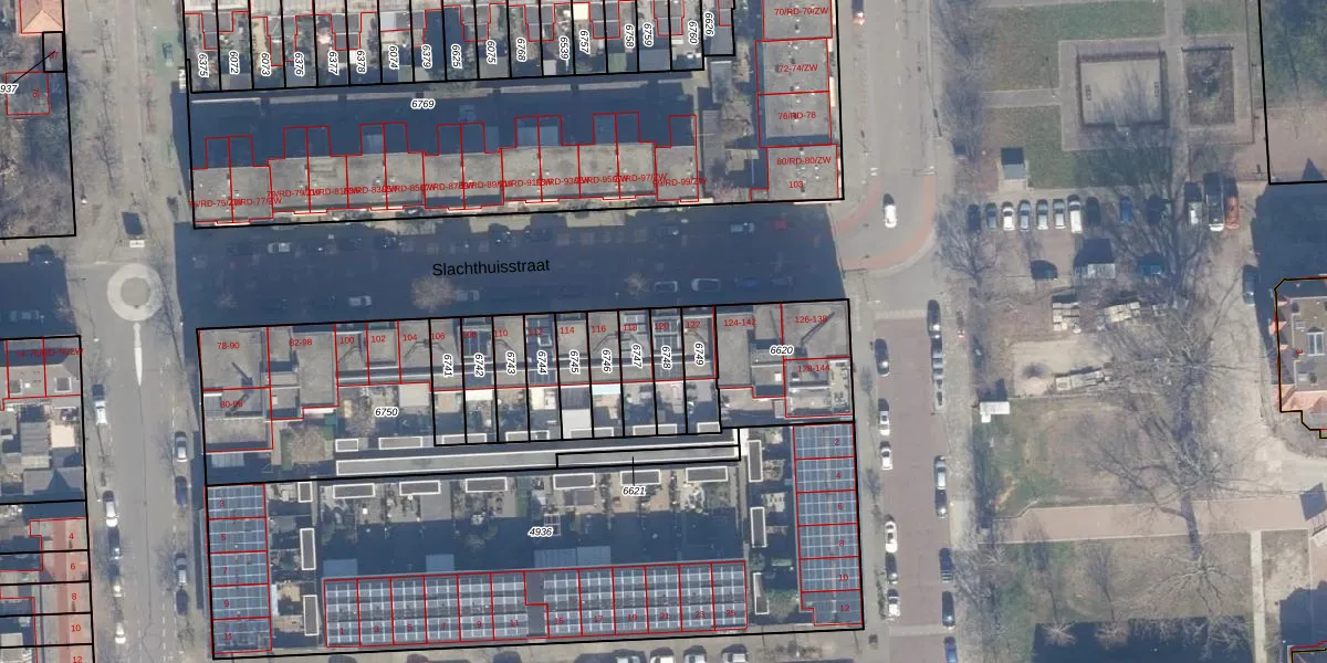 Het perceel waarop Slachthuisstraat 120 staat heeft een oppervlakte van 91 m². Dit is een klein perceel. De perceeloppervlakte wordt geregistreerd door het Kadaster. Gedetailleerde informatie over de maten van dit perceel kunt u vinden in het rapport Kadastrale kaart met maatvoering van Slachthuisstraat 120.