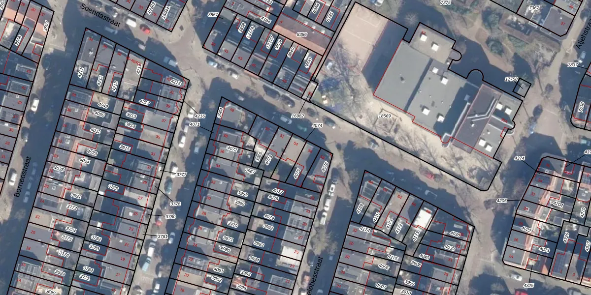 Het perceel waarop Soendastraat 54 staat heeft een oppervlakte van 87 m². Dit is een klein perceel. De perceeloppervlakte wordt geregistreerd door het Kadaster. Gedetailleerde informatie over de maten van dit perceel kunt u vinden in het rapport Kadastrale kaart met maatvoering van Soendastraat 54.