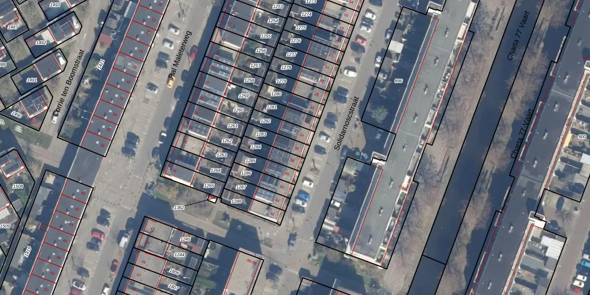 Het perceel waarop Solidarnoscstraat 36 staat heeft een oppervlakte van 106 m². Dit is een middelgroot perceel. De perceeloppervlakte wordt geregistreerd door het Kadaster. Gedetailleerde informatie over de maten van dit perceel kunt u vinden in het rapport Kadastrale kaart met maatvoering van Solidarnoscstraat 36.