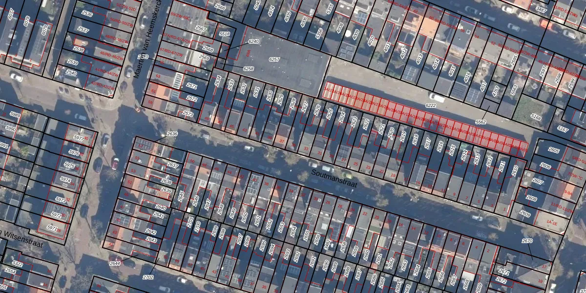 Het perceel waarop Soutmanstraat 35 staat heeft een oppervlakte van 88 m². Dit is een klein perceel. De perceeloppervlakte wordt geregistreerd door het Kadaster. Gedetailleerde informatie over de maten van dit perceel kunt u vinden in het rapport Kadastrale kaart met maatvoering van Soutmanstraat 35.