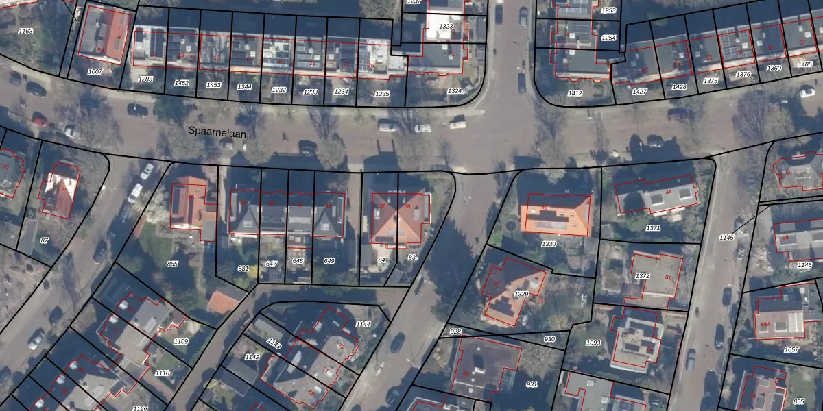 Spaarnelaan 38 is gelegen op kadastraal perceel HLM02R83. Deze kadastrale aanduiding is uniek en wordt gebruikt door het Kadaster om eigendomsrechten en andere zakelijke rechten vast te leggen. Het perceel maakt onderdeel uit van de kadastrale gemeente Haarlem.
