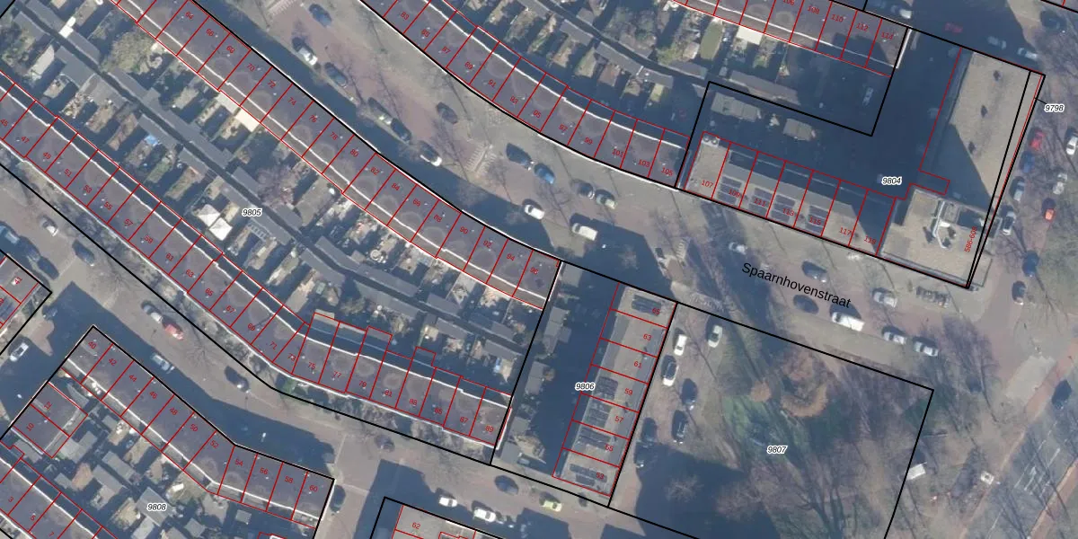 Spaarnhovenstraat 96 is gelegen op kadastraal perceel STN01B9805. Deze kadastrale aanduiding is uniek en wordt gebruikt door het Kadaster om eigendomsrechten en andere zakelijke rechten vast te leggen. Het perceel maakt onderdeel uit van de kadastrale gemeente Schoten.