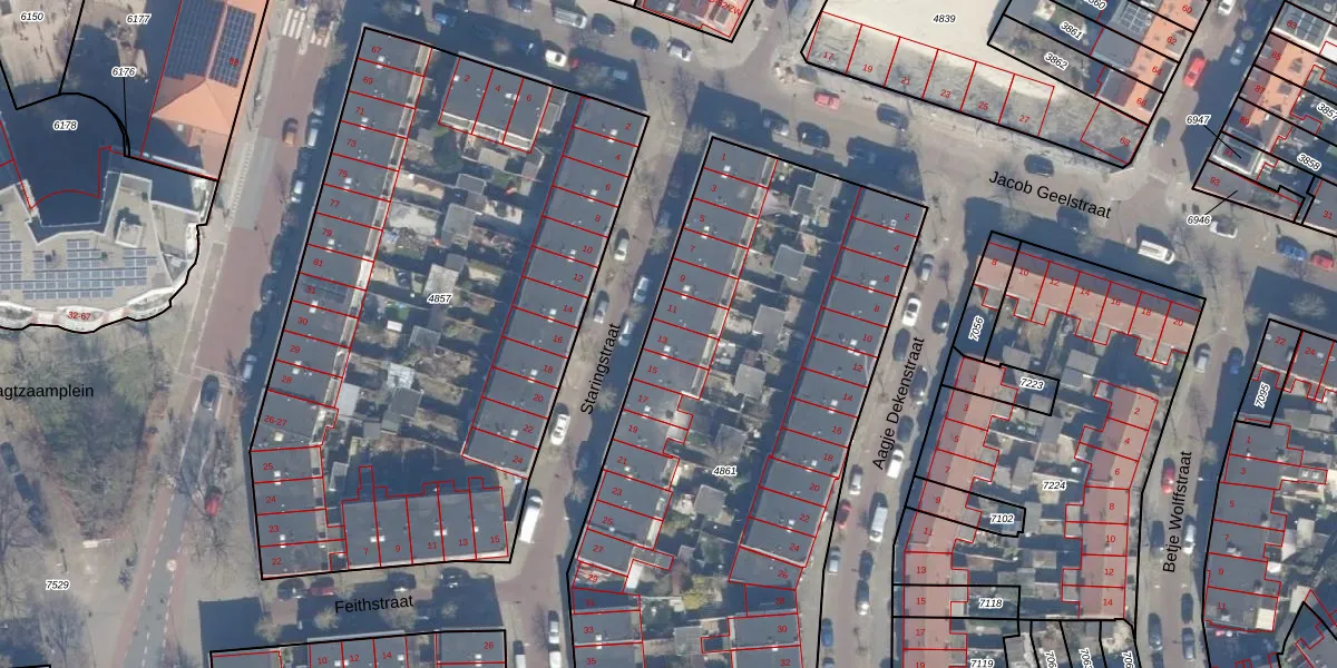 Het perceel waarop Staringstraat 13 staat heeft een oppervlakte van 3475 m². Dit is een zeer groot perceel. De perceeloppervlakte wordt geregistreerd door het Kadaster. Gedetailleerde informatie over de maten van dit perceel kunt u vinden in het rapport Kadastrale kaart met maatvoering van Staringstraat 13.