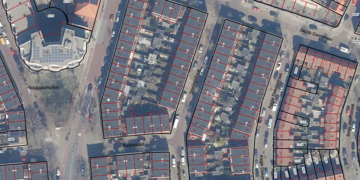 Het perceel waarop Staringstraat 20 staat heeft een oppervlakte van 3255 m². Dit is een zeer groot perceel. De perceeloppervlakte wordt geregistreerd door het Kadaster. Gedetailleerde informatie over de maten van dit perceel kunt u vinden in het rapport Kadastrale kaart met maatvoering van Staringstraat 20.