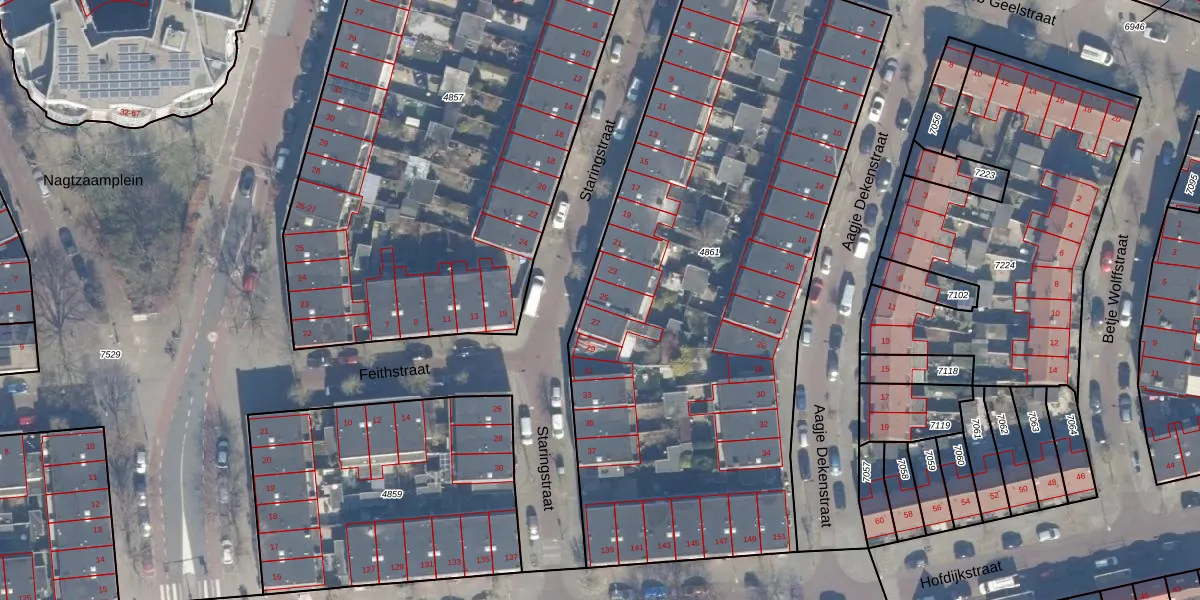 Het perceel waarop Staringstraat 25 staat heeft een oppervlakte van 3475 m². Dit is een zeer groot perceel. De perceeloppervlakte wordt geregistreerd door het Kadaster. Gedetailleerde informatie over de maten van dit perceel kunt u vinden in het rapport Kadastrale kaart met maatvoering van Staringstraat 25.