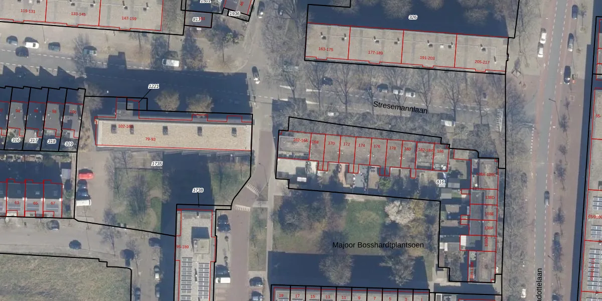 Het perceel waarop Stresemannlaan 166 staat heeft een oppervlakte van 2086 m². Dit is een zeer groot perceel. De perceeloppervlakte wordt geregistreerd door het Kadaster. Gedetailleerde informatie over de maten van dit perceel kunt u vinden in het rapport Kadastrale kaart met maatvoering van Stresemannlaan 166.