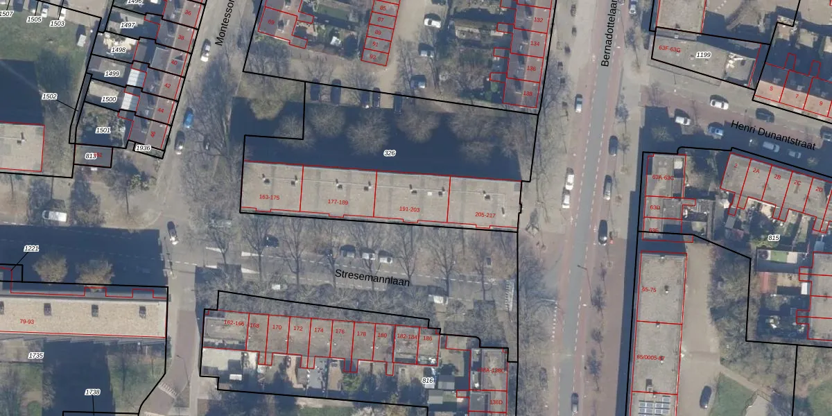 Stresemannlaan 195 is gelegen op kadastraal perceel HLM02X326. Deze kadastrale aanduiding is uniek en wordt gebruikt door het Kadaster om eigendomsrechten en andere zakelijke rechten vast te leggen. Het perceel maakt onderdeel uit van de kadastrale gemeente Haarlem.