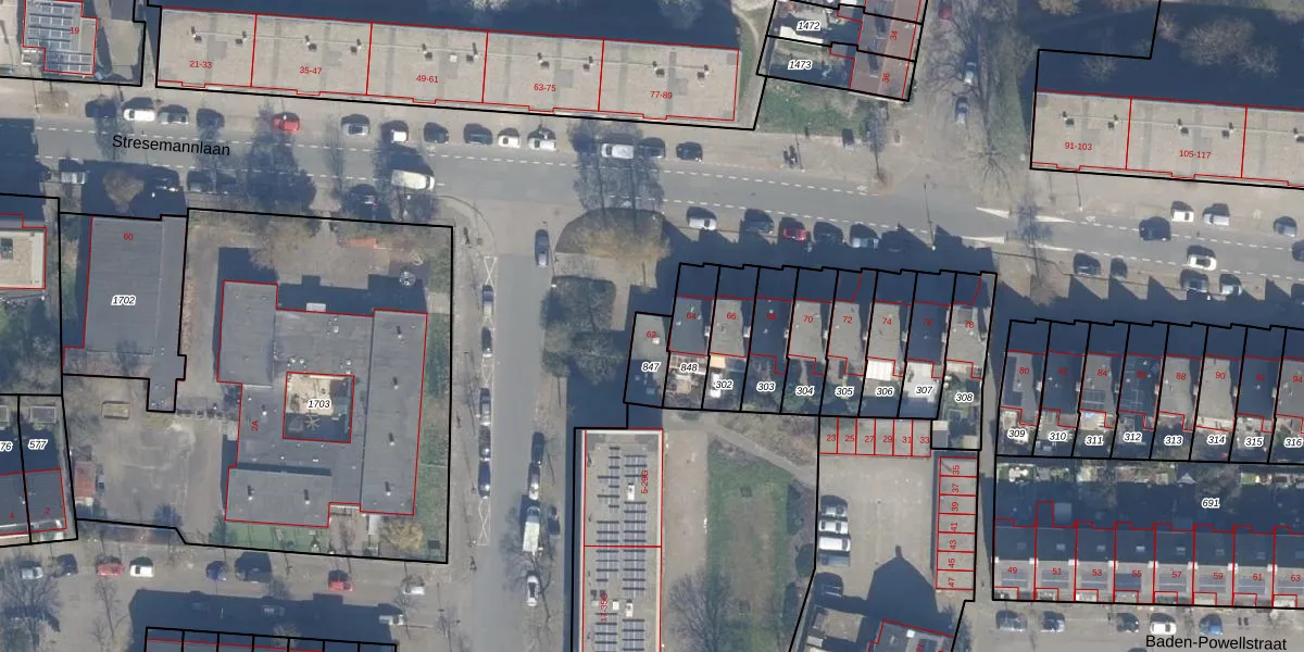 Het perceel waarop Stresemannlaan 62 staat heeft een oppervlakte van 80 m². Dit is een klein perceel. De perceeloppervlakte wordt geregistreerd door het Kadaster. Gedetailleerde informatie over de maten van dit perceel kunt u vinden in het rapport Kadastrale kaart met maatvoering van Stresemannlaan 62.