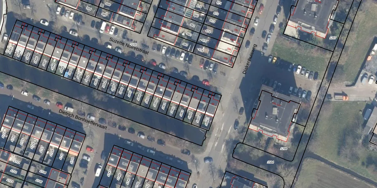 Het perceel waarop Suzette Noiretstraat 42 staat heeft een oppervlakte van 96 m². Dit is een klein perceel. De perceeloppervlakte wordt geregistreerd door het Kadaster. Gedetailleerde informatie over de maten van dit perceel kunt u vinden in het rapport Kadastrale kaart met maatvoering van Suzette Noiretstraat 42.