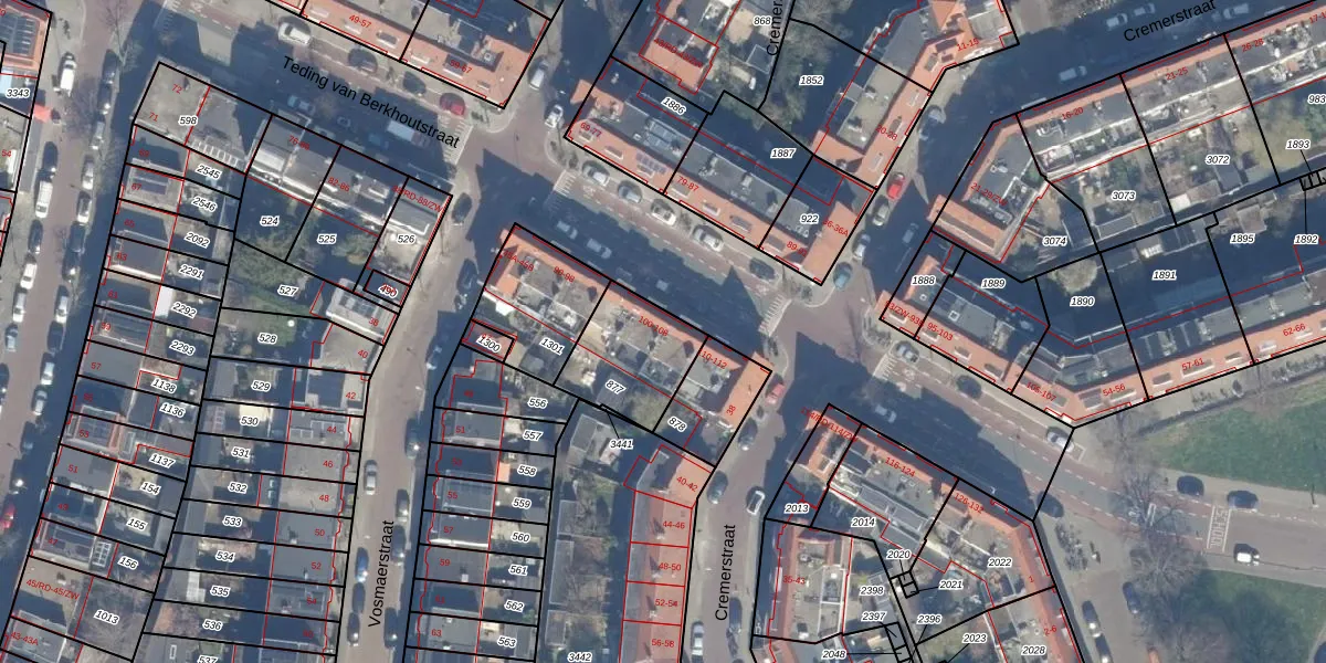 Teding van Berkhoutstraat 106 is gelegen op kadastraal perceel HLM02P877. Deze kadastrale aanduiding is uniek en wordt gebruikt door het Kadaster om eigendomsrechten en andere zakelijke rechten vast te leggen. Het perceel maakt onderdeel uit van de kadastrale gemeente Haarlem.