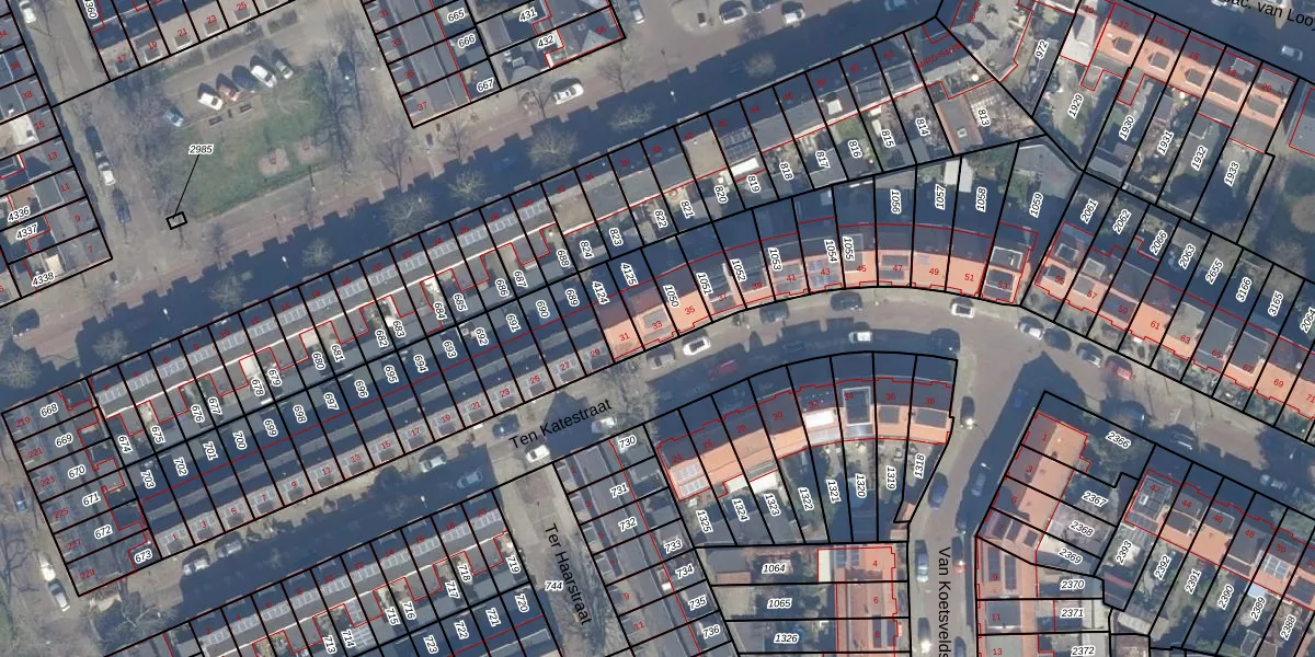 Het perceel waarop Ten Katestraat 33 staat heeft een oppervlakte van 82 m². Dit is een klein perceel. De perceeloppervlakte wordt geregistreerd door het Kadaster. Gedetailleerde informatie over de maten van dit perceel kunt u vinden in het rapport Kadastrale kaart met maatvoering van Ten Katestraat 33.