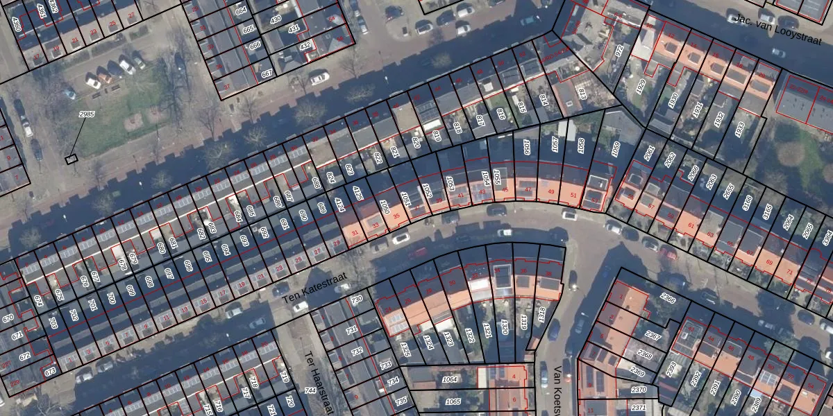 Het perceel waarop Ten Katestraat 37 staat heeft een oppervlakte van 81 m². Dit is een klein perceel. De perceeloppervlakte wordt geregistreerd door het Kadaster. Gedetailleerde informatie over de maten van dit perceel kunt u vinden in het rapport Kadastrale kaart met maatvoering van Ten Katestraat 37.