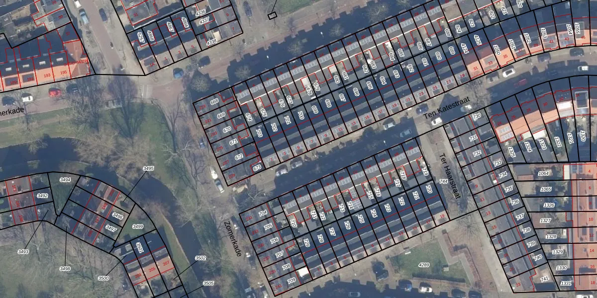 Ten Katestraat 5 is gelegen op kadastraal perceel HLM02P701. Deze kadastrale aanduiding is uniek en wordt gebruikt door het Kadaster om eigendomsrechten en andere zakelijke rechten vast te leggen. Het perceel maakt onderdeel uit van de kadastrale gemeente Haarlem.