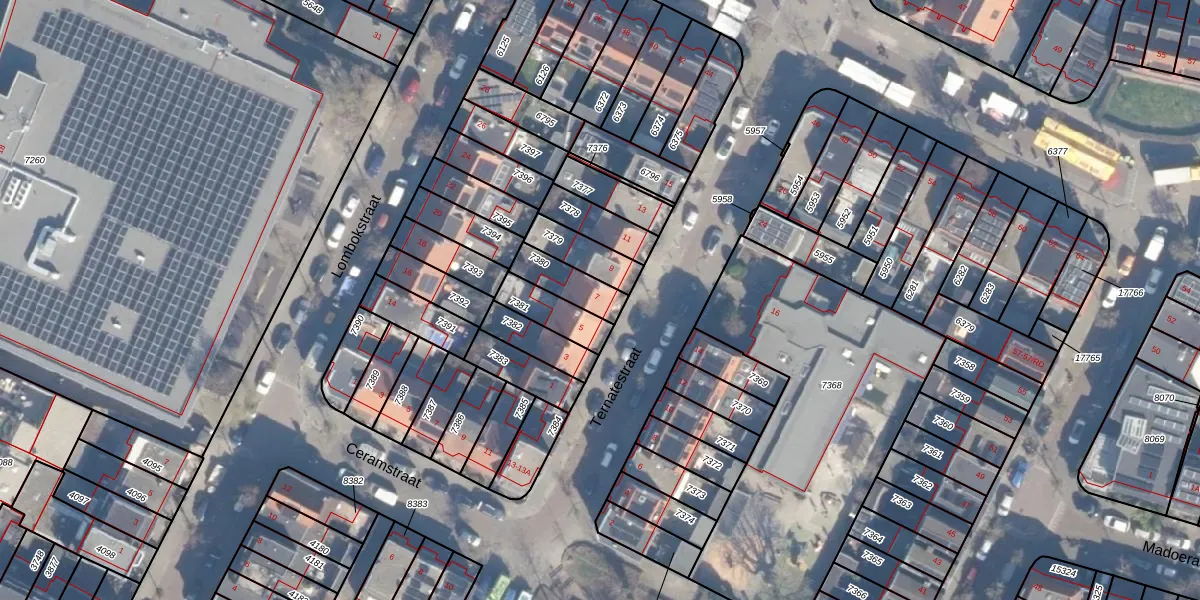Het perceel waarop Ternatestraat 7 staat heeft een oppervlakte van 108 m². Dit is een middelgroot perceel. De perceeloppervlakte wordt geregistreerd door het Kadaster. Gedetailleerde informatie over de maten van dit perceel kunt u vinden in het rapport Kadastrale kaart met maatvoering van Ternatestraat 7.