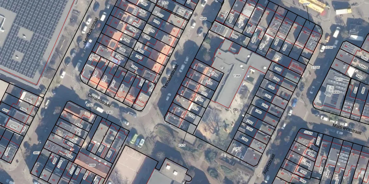 Het perceel waarop Ternatestraat 8 staat heeft een oppervlakte van 96 m². Dit is een klein perceel. De perceeloppervlakte wordt geregistreerd door het Kadaster. Gedetailleerde informatie over de maten van dit perceel kunt u vinden in het rapport Kadastrale kaart met maatvoering van Ternatestraat 8.