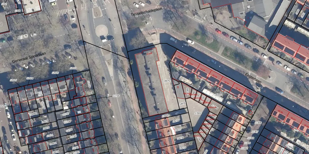 Het perceel waarop Tesselschadeplein 28 staat heeft een oppervlakte van 1169 m². Dit is een zeer groot perceel. De perceeloppervlakte wordt geregistreerd door het Kadaster. Gedetailleerde informatie over de maten van dit perceel kunt u vinden in het rapport Kadastrale kaart met maatvoering van Tesselschadeplein 28.