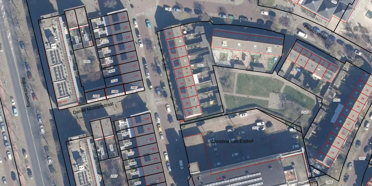 Het perceel waarop Tesselschadestraat 20 staat heeft een oppervlakte van 2177 m². Dit is een zeer groot perceel. De perceeloppervlakte wordt geregistreerd door het Kadaster. Gedetailleerde informatie over de maten van dit perceel kunt u vinden in het rapport Kadastrale kaart met maatvoering van Tesselschadestraat 20.