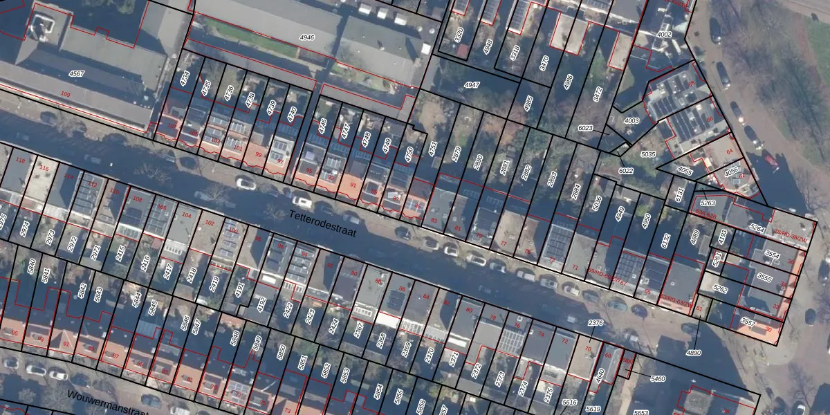 Tetterodestraat 85 is gelegen op kadastraal perceel HLM01A4751. Deze kadastrale aanduiding is uniek en wordt gebruikt door het Kadaster om eigendomsrechten en andere zakelijke rechten vast te leggen. Het perceel maakt onderdeel uit van de kadastrale gemeente Haarlem.