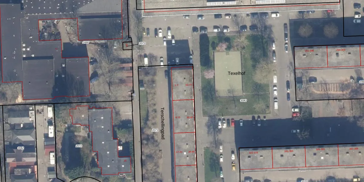 Het perceel waarop Texelhof 66 staat heeft een oppervlakte van 2228 m². Dit is een zeer groot perceel. De perceeloppervlakte wordt geregistreerd door het Kadaster. Gedetailleerde informatie over de maten van dit perceel kunt u vinden in het rapport Kadastrale kaart met maatvoering van Texelhof 66.