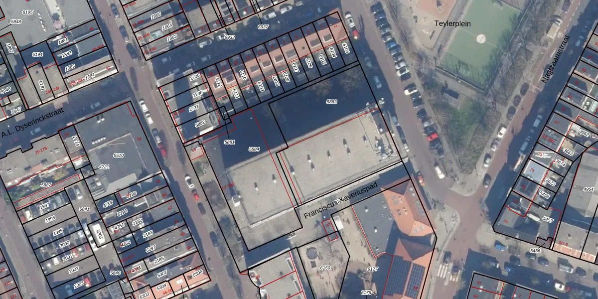 Het perceel waarop Teylerplein 120 staat heeft een oppervlakte van 1273 m². Dit is een zeer groot perceel. De perceeloppervlakte wordt geregistreerd door het Kadaster. Gedetailleerde informatie over de maten van dit perceel kunt u vinden in het rapport Kadastrale kaart met maatvoering van Teylerplein 120.