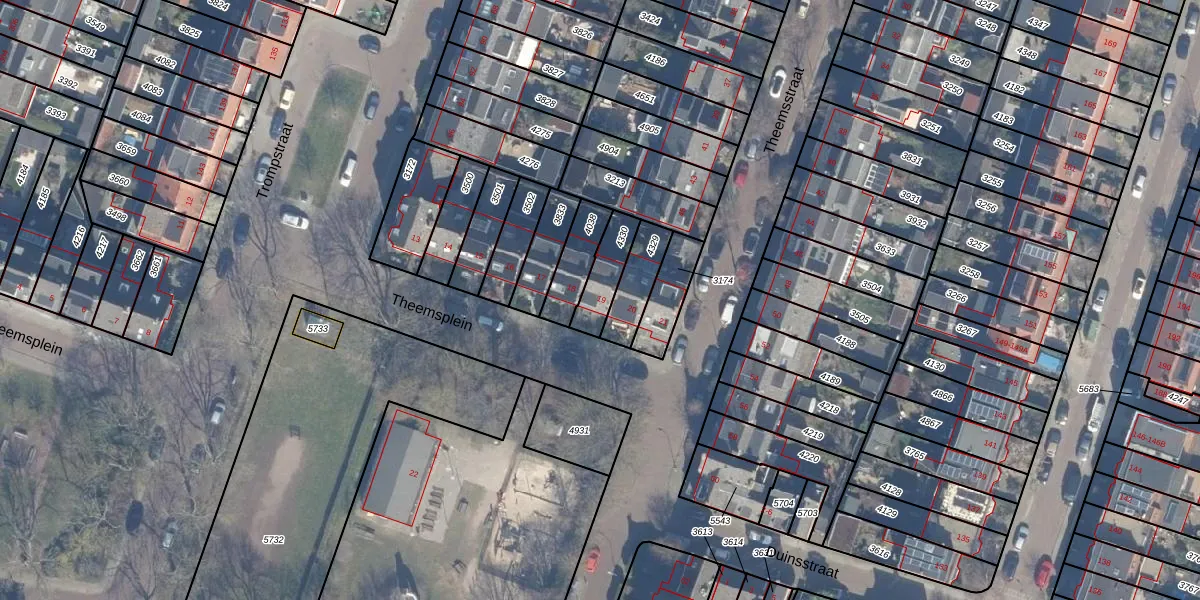Het perceel waarop Theemsplein 19 staat heeft een oppervlakte van 112 m². Dit is een middelgroot perceel. De perceeloppervlakte wordt geregistreerd door het Kadaster. Gedetailleerde informatie over de maten van dit perceel kunt u vinden in het rapport Kadastrale kaart met maatvoering van Theemsplein 19.