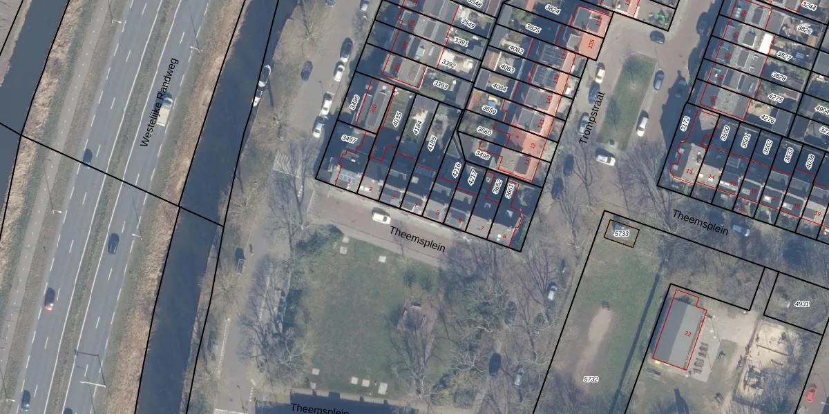 Theemsplein 4 is gelegen op kadastraal perceel HLM01I4185. Deze kadastrale aanduiding is uniek en wordt gebruikt door het Kadaster om eigendomsrechten en andere zakelijke rechten vast te leggen. Het perceel maakt onderdeel uit van de kadastrale gemeente Haarlem.