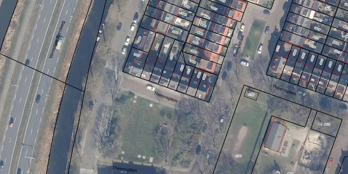 Theemsplein 5 is gelegen op kadastraal perceel HLM01I4216. Deze kadastrale aanduiding is uniek en wordt gebruikt door het Kadaster om eigendomsrechten en andere zakelijke rechten vast te leggen. Het perceel maakt onderdeel uit van de kadastrale gemeente Haarlem.