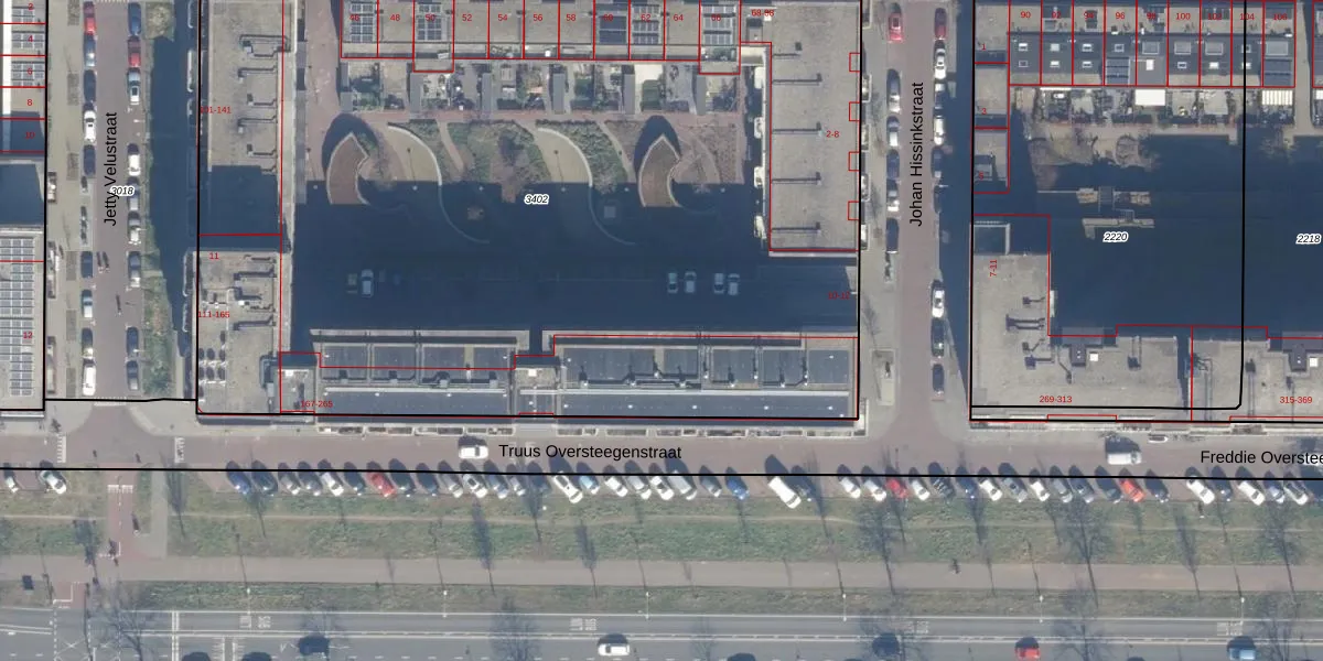Het perceel waarop Truus Oversteegenstraat 187 staat heeft een oppervlakte van 6399 m². Dit is een zeer groot perceel. De perceeloppervlakte wordt geregistreerd door het Kadaster. Gedetailleerde informatie over de maten van dit perceel kunt u vinden in het rapport Kadastrale kaart met maatvoering van Truus Oversteegenstraat 187.