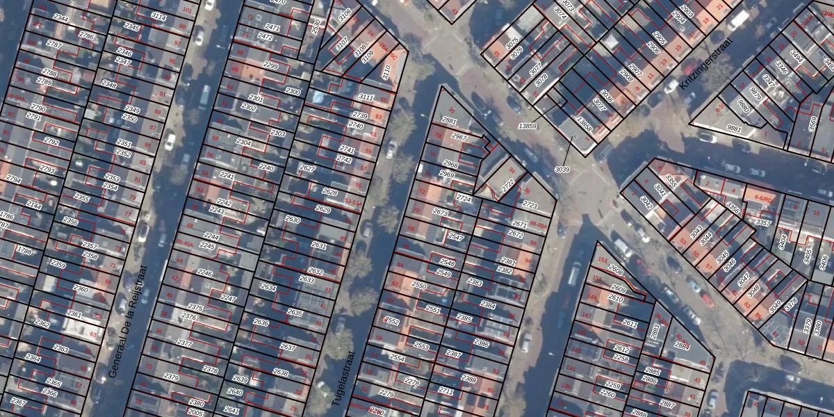 Het perceel waarop Tugelastraat 70 staat heeft een oppervlakte van 77 m². Dit is een klein perceel. De perceeloppervlakte wordt geregistreerd door het Kadaster. Gedetailleerde informatie over de maten van dit perceel kunt u vinden in het rapport Kadastrale kaart met maatvoering van Tugelastraat 70.