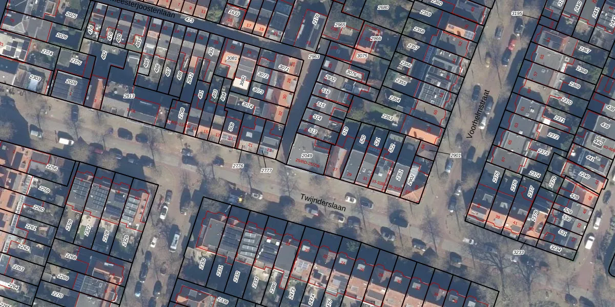 Twijnderslaan 25-RD is gelegen op kadastraal perceel HLM01K2049. Deze kadastrale aanduiding is uniek en wordt gebruikt door het Kadaster om eigendomsrechten en andere zakelijke rechten vast te leggen. Het perceel maakt onderdeel uit van de kadastrale gemeente Haarlem.