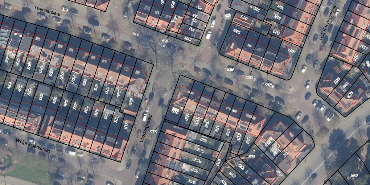 Twijnderslaan 38 is gelegen op kadastraal perceel HLM01K2511. Deze kadastrale aanduiding is uniek en wordt gebruikt door het Kadaster om eigendomsrechten en andere zakelijke rechten vast te leggen. Het perceel maakt onderdeel uit van de kadastrale gemeente Haarlem.