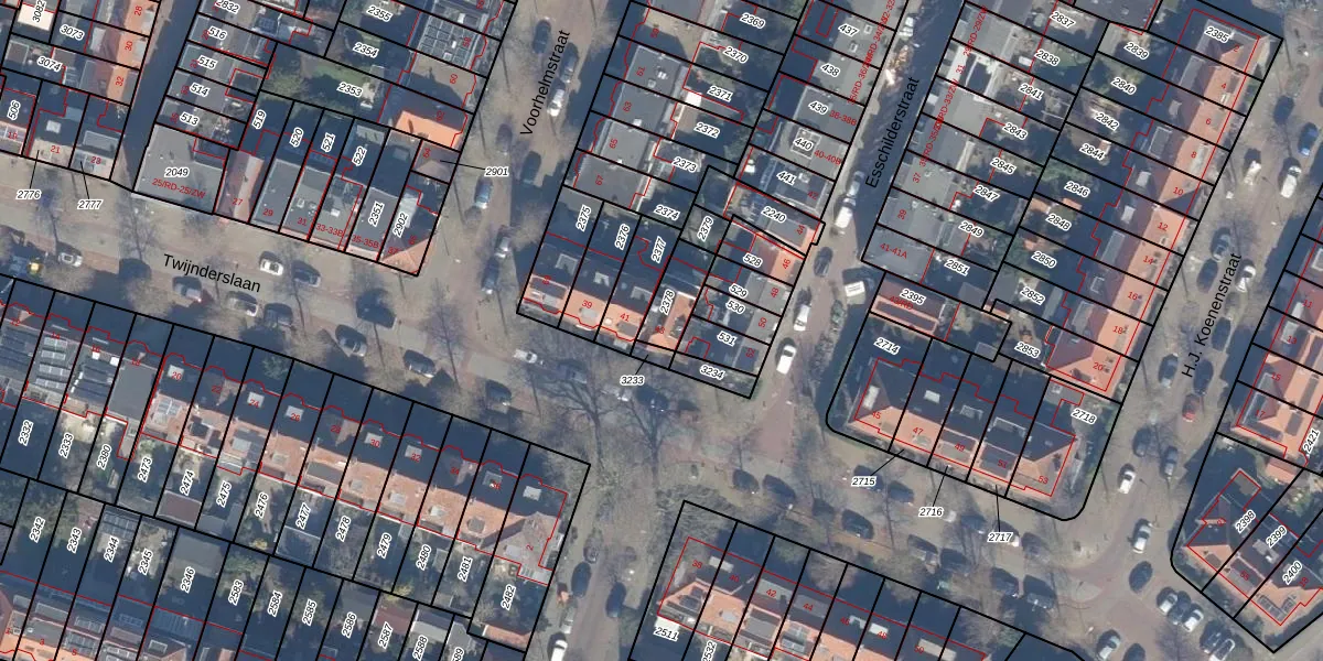 Het perceel waarop Twijnderslaan 43 staat heeft een oppervlakte van 98 m². Dit is een klein perceel. De perceeloppervlakte wordt geregistreerd door het Kadaster. Gedetailleerde informatie over de maten van dit perceel kunt u vinden in het rapport Kadastrale kaart met maatvoering van Twijnderslaan 43.