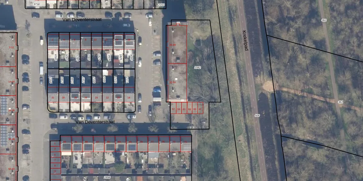 Het perceel waarop Van Deventerstraat 55 staat heeft een oppervlakte van 1553 m². Dit is een zeer groot perceel. De perceeloppervlakte wordt geregistreerd door het Kadaster. Gedetailleerde informatie over de maten van dit perceel kunt u vinden in het rapport Kadastrale kaart met maatvoering van Van Deventerstraat 55.