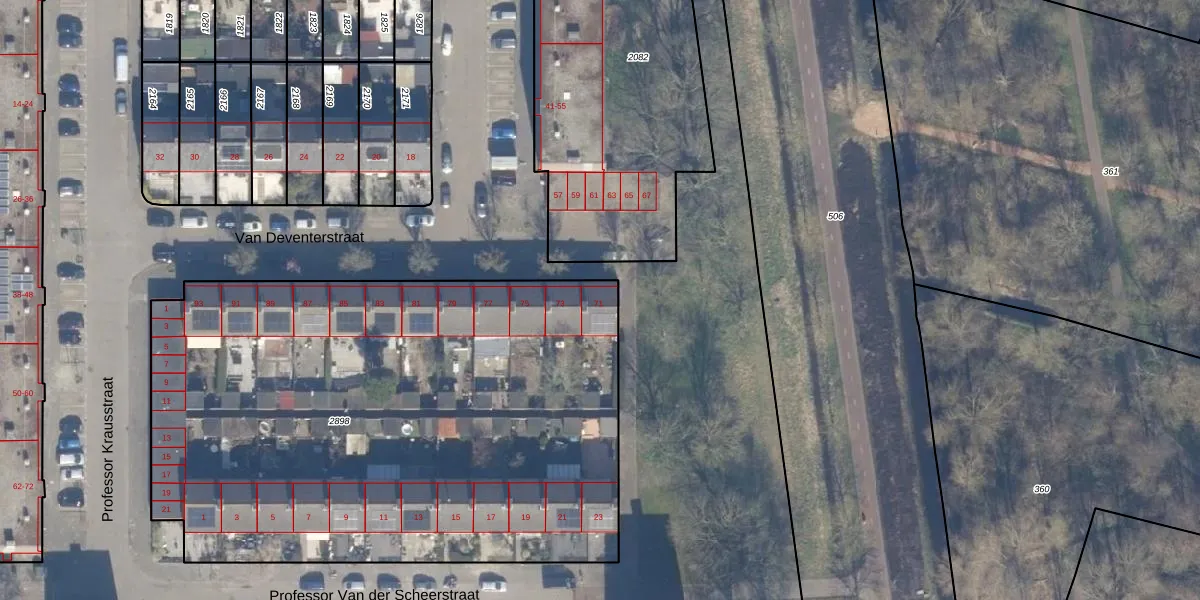 Het perceel waarop Van Deventerstraat 71 staat heeft een oppervlakte van 3605 m². Dit is een zeer groot perceel. De perceeloppervlakte wordt geregistreerd door het Kadaster. Gedetailleerde informatie over de maten van dit perceel kunt u vinden in het rapport Kadastrale kaart met maatvoering van Van Deventerstraat 71.