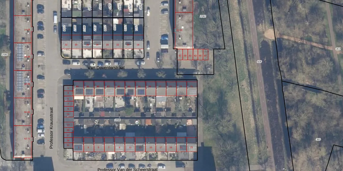 Het perceel waarop Van Deventerstraat 75 staat heeft een oppervlakte van 3605 m². Dit is een zeer groot perceel. De perceeloppervlakte wordt geregistreerd door het Kadaster. Gedetailleerde informatie over de maten van dit perceel kunt u vinden in het rapport Kadastrale kaart met maatvoering van Van Deventerstraat 75.