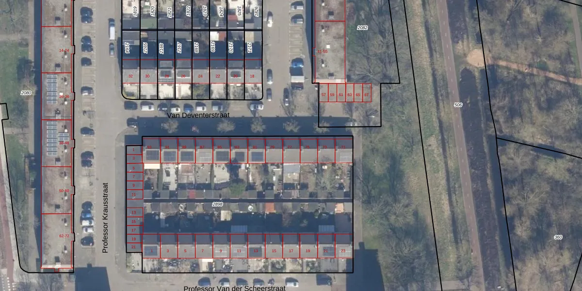 Het perceel waarop Van Deventerstraat 77 staat heeft een oppervlakte van 3605 m². Dit is een zeer groot perceel. De perceeloppervlakte wordt geregistreerd door het Kadaster. Gedetailleerde informatie over de maten van dit perceel kunt u vinden in het rapport Kadastrale kaart met maatvoering van Van Deventerstraat 77.