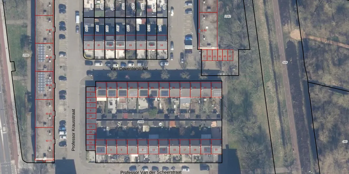 Het perceel waarop Van Deventerstraat 79 staat heeft een oppervlakte van 3605 m². Dit is een zeer groot perceel. De perceeloppervlakte wordt geregistreerd door het Kadaster. Gedetailleerde informatie over de maten van dit perceel kunt u vinden in het rapport Kadastrale kaart met maatvoering van Van Deventerstraat 79.