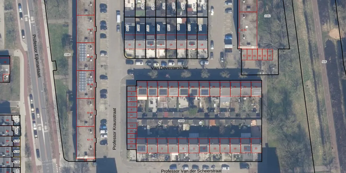 Het perceel waarop Van Deventerstraat 87 staat heeft een oppervlakte van 3605 m². Dit is een zeer groot perceel. De perceeloppervlakte wordt geregistreerd door het Kadaster. Gedetailleerde informatie over de maten van dit perceel kunt u vinden in het rapport Kadastrale kaart met maatvoering van Van Deventerstraat 87.