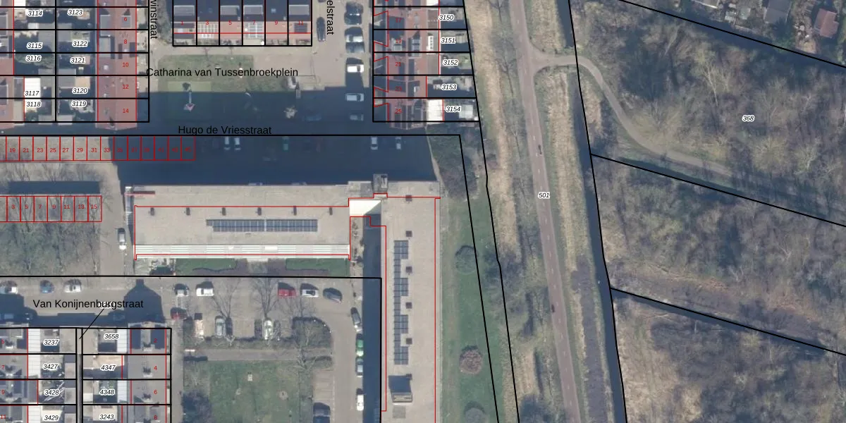 Het perceel waarop Van Konijnenburgstraat 125 staat heeft een oppervlakte van 7433 m². Dit is een zeer groot perceel. De perceeloppervlakte wordt geregistreerd door het Kadaster. Gedetailleerde informatie over de maten van dit perceel kunt u vinden in het rapport Kadastrale kaart met maatvoering van Van Konijnenburgstraat 125.