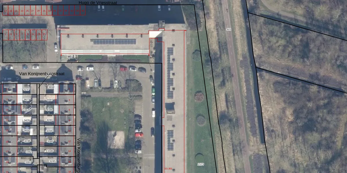 Het perceel waarop Van Konijnenburgstraat 145 staat heeft een oppervlakte van 7433 m². Dit is een zeer groot perceel. De perceeloppervlakte wordt geregistreerd door het Kadaster. Gedetailleerde informatie over de maten van dit perceel kunt u vinden in het rapport Kadastrale kaart met maatvoering van Van Konijnenburgstraat 145.