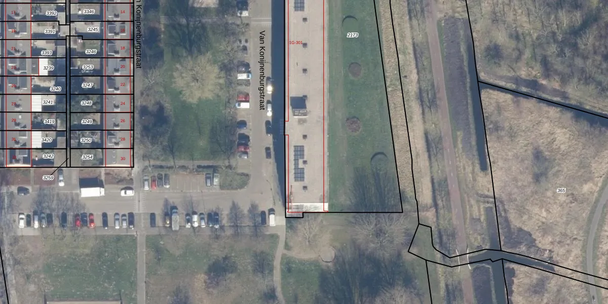 Het perceel waarop Van Konijnenburgstraat 251 staat heeft een oppervlakte van 7433 m². Dit is een zeer groot perceel. De perceeloppervlakte wordt geregistreerd door het Kadaster. Gedetailleerde informatie over de maten van dit perceel kunt u vinden in het rapport Kadastrale kaart met maatvoering van Van Konijnenburgstraat 251.
