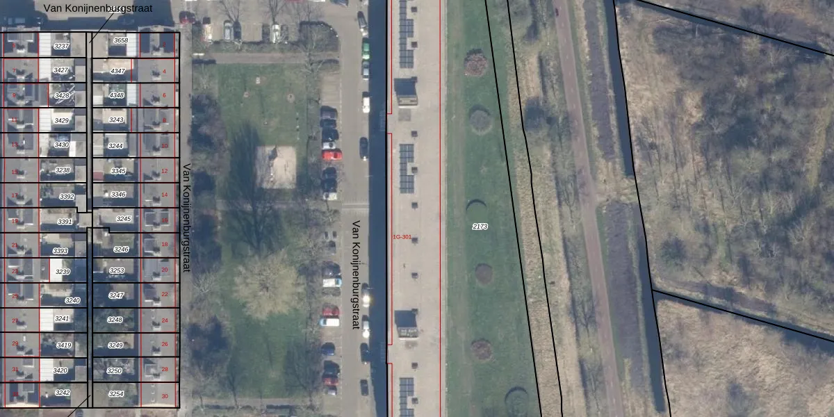 Het perceel waarop Van Konijnenburgstraat 255 staat heeft een oppervlakte van 7433 m². Dit is een zeer groot perceel. De perceeloppervlakte wordt geregistreerd door het Kadaster. Gedetailleerde informatie over de maten van dit perceel kunt u vinden in het rapport Kadastrale kaart met maatvoering van Van Konijnenburgstraat 255.