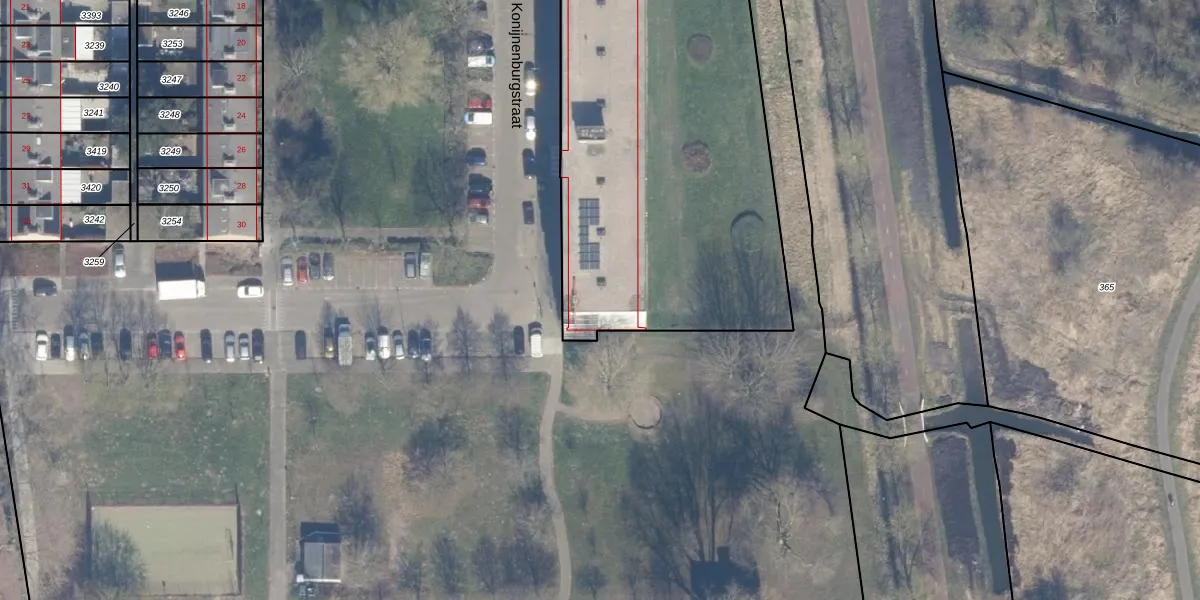 Het perceel waarop Van Konijnenburgstraat 299 staat heeft een oppervlakte van 7433 m². Dit is een zeer groot perceel. De perceeloppervlakte wordt geregistreerd door het Kadaster. Gedetailleerde informatie over de maten van dit perceel kunt u vinden in het rapport Kadastrale kaart met maatvoering van Van Konijnenburgstraat 299.