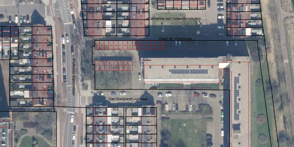Het perceel waarop Van Konijnenburgstraat 47 staat heeft een oppervlakte van 7433 m². Dit is een zeer groot perceel. De perceeloppervlakte wordt geregistreerd door het Kadaster. Gedetailleerde informatie over de maten van dit perceel kunt u vinden in het rapport Kadastrale kaart met maatvoering van Van Konijnenburgstraat 47.