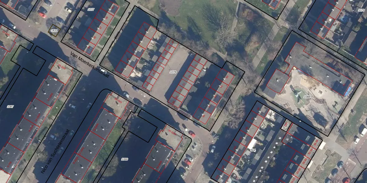 Het perceel waarop Van Moerkerkenstraat 79 staat heeft een oppervlakte van 2427 m². Dit is een zeer groot perceel. De perceeloppervlakte wordt geregistreerd door het Kadaster. Gedetailleerde informatie over de maten van dit perceel kunt u vinden in het rapport Kadastrale kaart met maatvoering van Van Moerkerkenstraat 79.