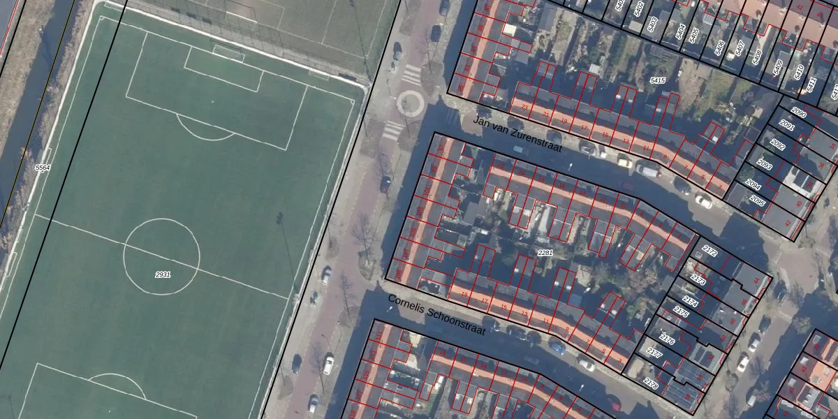 Het perceel waarop Van Oosten de Bruijnstraat 103 staat heeft een oppervlakte van 2390 m². Dit is een zeer groot perceel. De perceeloppervlakte wordt geregistreerd door het Kadaster. Gedetailleerde informatie over de maten van dit perceel kunt u vinden in het rapport Kadastrale kaart met maatvoering van Van Oosten de Bruijnstraat 103.