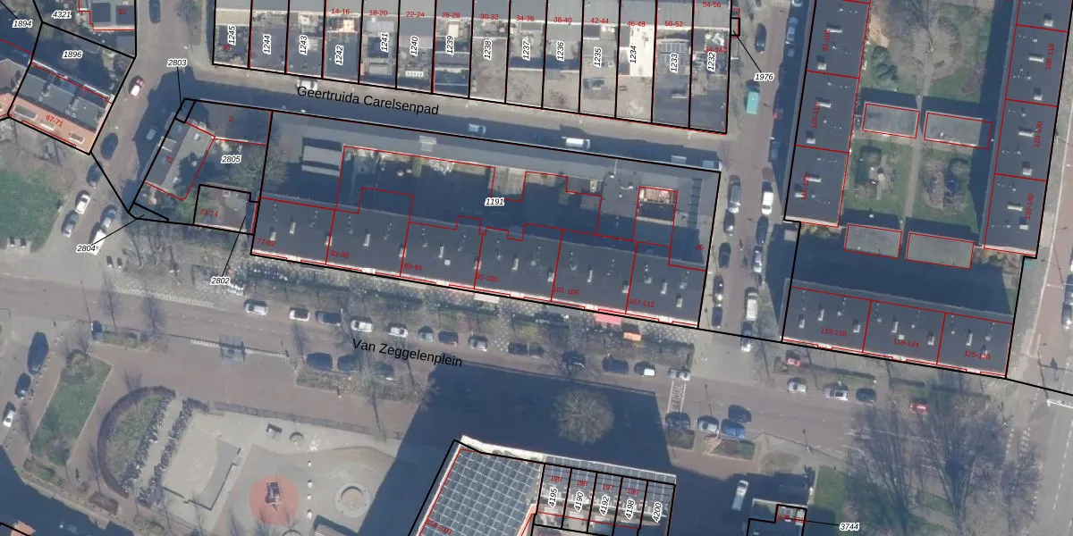 Het perceel waarop Van Zeggelenplein 99 staat heeft een oppervlakte van 2380 m². Dit is een zeer groot perceel. De perceeloppervlakte wordt geregistreerd door het Kadaster. Gedetailleerde informatie over de maten van dit perceel kunt u vinden in het rapport Kadastrale kaart met maatvoering van Van Zeggelenplein 99.